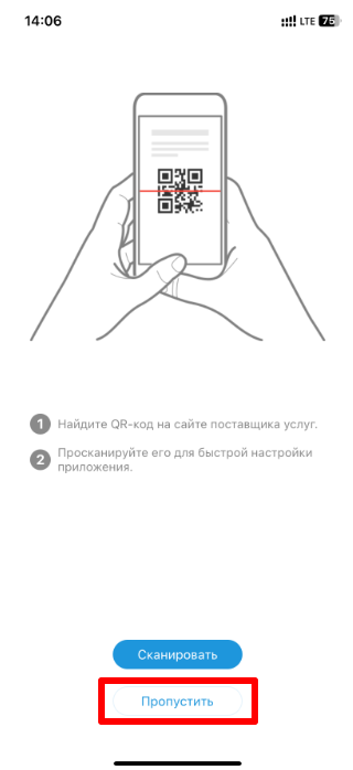 При первоначальном запуске мобильного приложения, необходимо нажать на кнопку “Пропустить” или отсканировать QR-код на странице Авторизации на сайте.