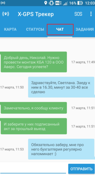 В разделе “Сообщения” диспетчер может обмениваться текстовыми сообщениями с мобильными сотрудниками, использующими мобильное приложение “X-GPS Трекер”. Сообщения отправляются через сеть Интернет.