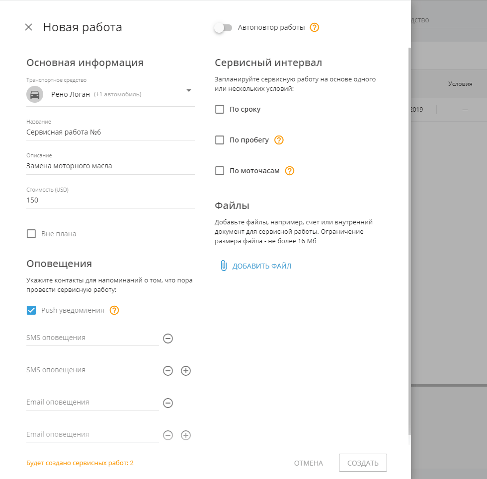 описание сервисной работы - добавьте информацию о создаваемой сервисной работе. Например, предпочитаемую марку моторного масла или название и контакты СТО для проведения сервисной работы
