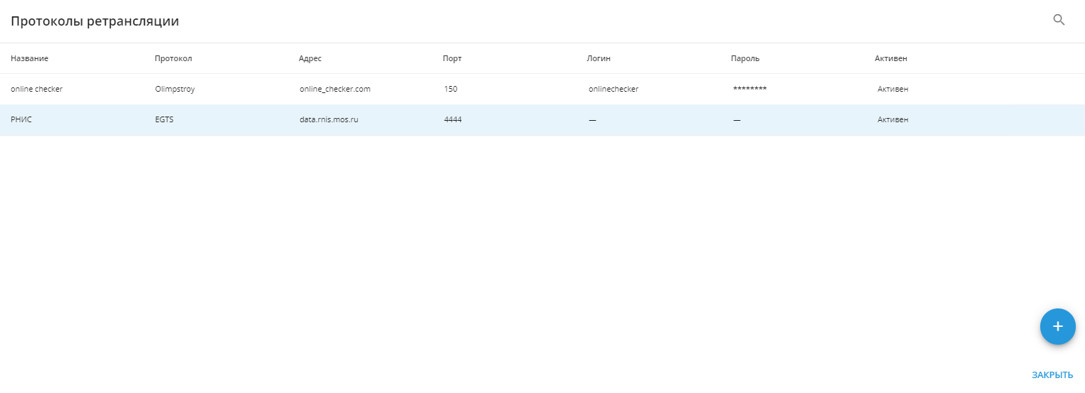 Ретрансляция данных - это пересылка данных, поступающих от трекеров с сервера “ГдеМои” на указанные пользователем сторонние серверы. Например, это могут быть серверы надзорных ведомств (“Ространснадзор” или “РНИС”) или логистические IT-системы. Такая пересылка осуществляется online - без задержки, непосредственно в момент получения данных. Они пересылаются по определенному протоколу передачи данных на указанный пользователем адрес и порт с использованием авторизации или без.