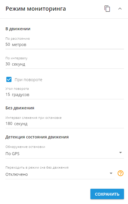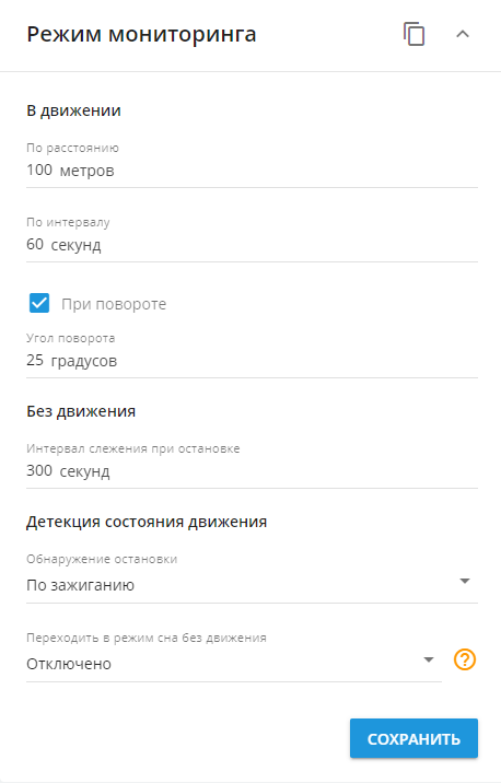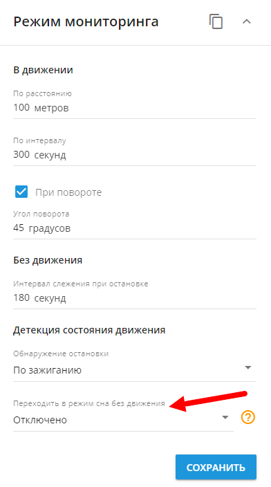 Данный режим позволяет экономить заряд внутреннего АКБ устройства, а также сохранять заряд аккумулятора автомобиля к которому подключено устройство. Устройство переходит в режим сна, если не детектирует движение, при этом соединение с сервером сохраняется.