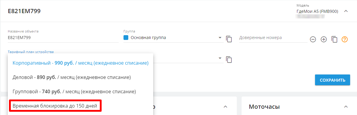 Для блокировки устройства в системе мониторинга измените тарифный план на "Временная блокировка до 150 дней".