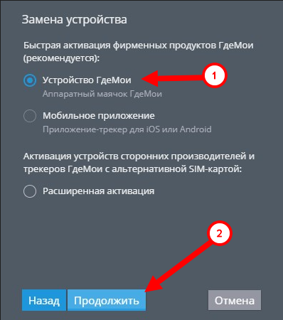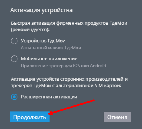 Выберите пункт “Устройство ГдеМои” и нажмите кнопку “Продолжить”