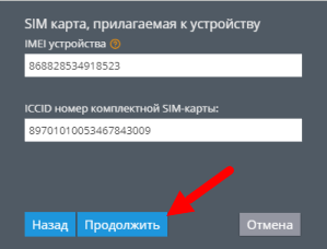 Введите ICCID-номер SIM-карты и IMEI устройства и нажмите “Продолжить”